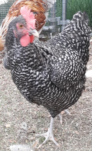 She is a Barred Plymouth Rock that lays light brown eggs.